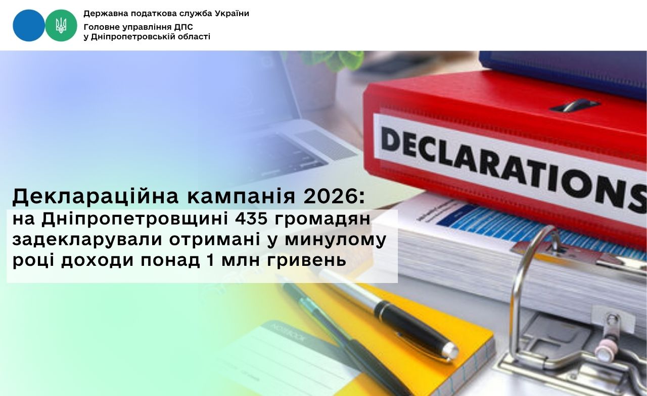 Головне управління ДПС у Дніпропетровській області повідомляє, що протягом січня – лютого поточного року, станом на 01.03.2026, фізичними особами регіону за 2025 рік подано 3 255 податкових декларацій про майновий стан і доходи (далі – Декларація). Загальна сума задекларованого ними доходу становить 2 818,7 млн гривень. У порівнянні з 2025 роком це на 322 Декларації більше (станом на 01.03.2025 – 2 933 Декларації), задекларована сума доходу збільшилась на 806,0 млн грн (станом на 01.03.2025 – 2 012,9 млн гривень).