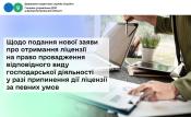 Відповідно до частини дев’ятої ст. 39 Закону № 3817 у разі припинення дії ліцензії на право провадження відповідного виду господарської діяльності суб’єкт господарювання може подати нову заяву про отримання ліцензії на право провадження відповідного виду господарської діяльності після усунення порушень, що були підставами для припинення дії ліцензії, крім випадків припинення дії ліцензії на право виробництва та/або оптової торгівлі спиртом етиловим, спиртовими дистилятами, алкогольними напоями, тютюновими виробами, рідинами, що використовуються в електронних сигаретах, та пальним, у яких суб’єкт господарювання може подати нову заяву про отримання ліцензії на право провадження відповідного виду господарської діяльності після усунення порушень, що були підставами для припинення дії ліцензії, але не раніше ніж через шість місяців з дати прийняття органом ліцензування відповідного рішення про припинення дії ліцензії на право провадження такого виду господарської діяльності (крім припинення дії ліцензії з підстав, визначених пунктами 1, 7, 35 і 36 частини другої ст. 39 Закону № 3817).