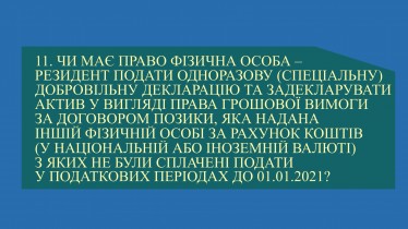 Чи має право фізична особа – резидент подати одноразову (спеціальну) добровільну декларацію та задекларувати актив у вигляді права грошової вимоги, яка надана іншій фізичній особі за рахунок коштів, з яких не були сплачені подати до 01.01.2021?
