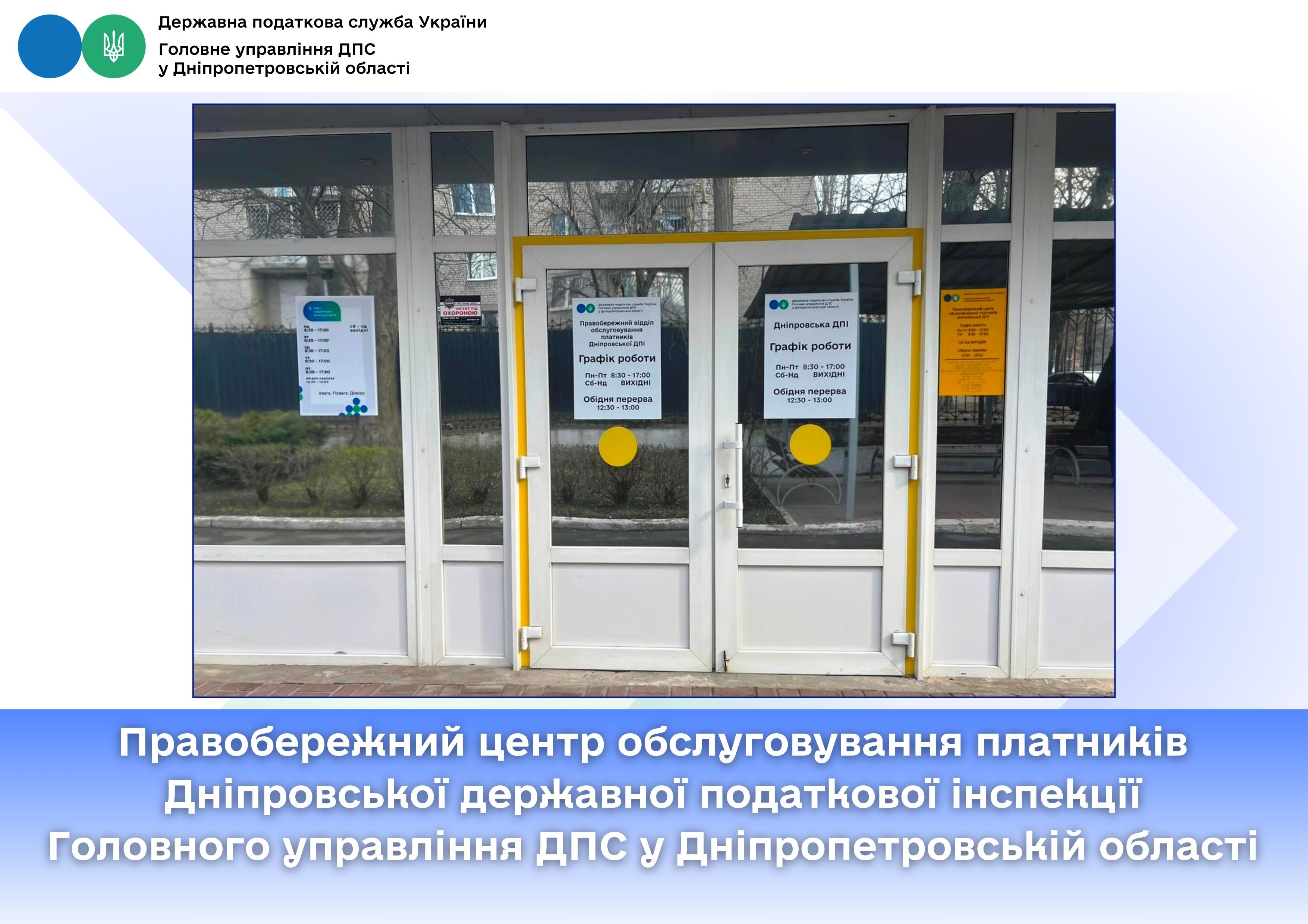 розташований у залі № 4 Правобережного центру обслуговування платників Дніпровської державної податкової інспекції Головного управління ДПС у Дніпропетровській області